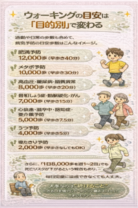 通勤や日常の歩数も含めて、病気予防の目安歩数はこんなイメージ。 肥満予防:12,000歩(早歩き40分) メタボ予防:10,000歩(早歩き30分) 高血圧・糖尿病・脂質異常:8,000歩(早歩き20分) 骨粗しょう症・動脈硬化・がん:7,000歩(早歩き15分) 心疾患・脳卒中・認知症・要介護予防:5,000歩(早歩き7.5分) うつ予防:4,000歩(早歩き5分) 寝たきり予防:2,000歩(早歩きなしでもOK) さらに、「1日8,000歩を週1〜2回」でも死亡リスクが下がるという報告もあり、 毎日完璧に達成できなくても大丈夫。 大事なのは“続けること”。 できる日を増やして、コツコツ積み上げていきましょう。 #中洲整体 #なかすヘッドマッサージ #はかたヘッドマッサージ #博多マッサージ  #脳洗浄 #博多脳洗浄 #中洲脳洗浄 #博多整体 #中洲小顔矯正 #博多小顔矯正 #中洲リンパマッサージ #博多オイル #中洲オイル #博多リンパマッサージ #リンパマッサージ #中洲肩こり #博多肩こり #中洲腰痛 #博多腰痛