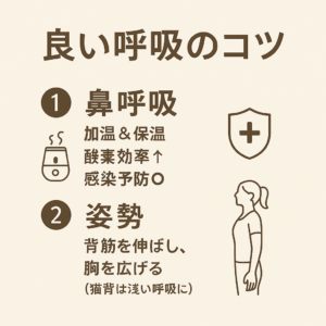 コツ:日常で鼻呼吸を意識+胸・腹・股関節前面のストレッチを定期的に。