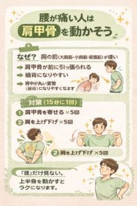 腰が代わりに動きすぎて負担が集中 → 腰痛につながることも。